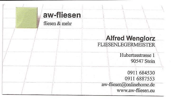 in der Zwischenzeit erreichen Sie uns wie immer telefonisch unter 0911 684530 und per Telefax unter 0911 6887553 Natürlich freuen wir uns auch über eine E-Mail von Ihnen, die Sie an diese Adresse senden können: aw-fliesen@onlinehome.de